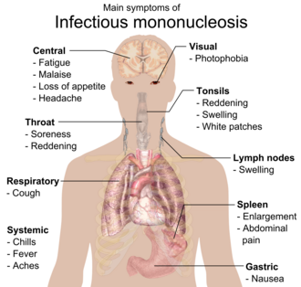 Infekčná mononukleóza, skrátene "mono", je infekčná choroba obvykle spôsobená Epstein-Barrovým vírusom (EBV). Väčšina ľudí sa infikuje v detskom veku, kedy choroba vyvolá malé alebo žiadne symptómy. U mladých dospelých, choroba často spôsobí horúčku, bolesť hrdla, zväčšené lyfatické uzliny v krku a únavu. Väčšine ľudí sa stav zlepší za 2 až 4 týždne, ale pocit únavy môže trvať mesiace. Pečeň a slezina sa tiež môžu zduriť. U menej ako percenta prípadov môže nastať poškodenie sleziny.